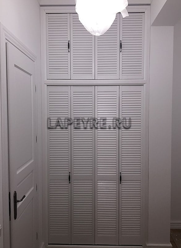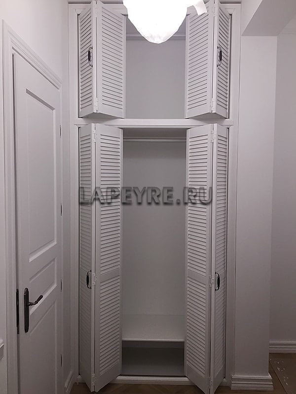 Складной шкаф из 100% массива дерева с бесшумным рельсовым механизмом, очень удобный в использовании; в открытом состоянии складные створки не занимают много места и позволяют полностью видеть все его наполнение. Поставляется в комплекте с коробкой и направляющим механизмом; возможна окраска в любой цвет, а так же любая финишная отделка.- Н по коробке = H полотна + 4,0 см
