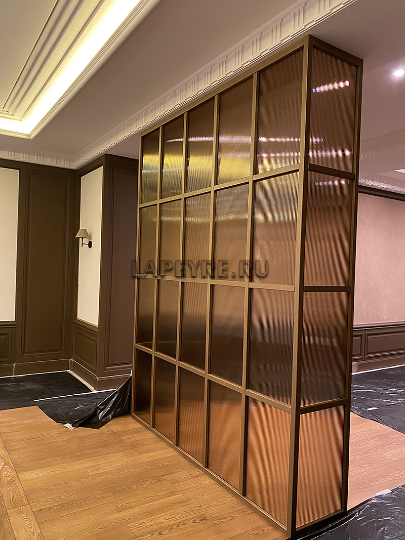 Достойное украшение этой стильной и нарядной остекленной межкомнатной перегородки — ручка для межкомнатных дверей «Manoir» («Brionne», Франция), массивное литье из латуни, цвет — состаренная латунь.