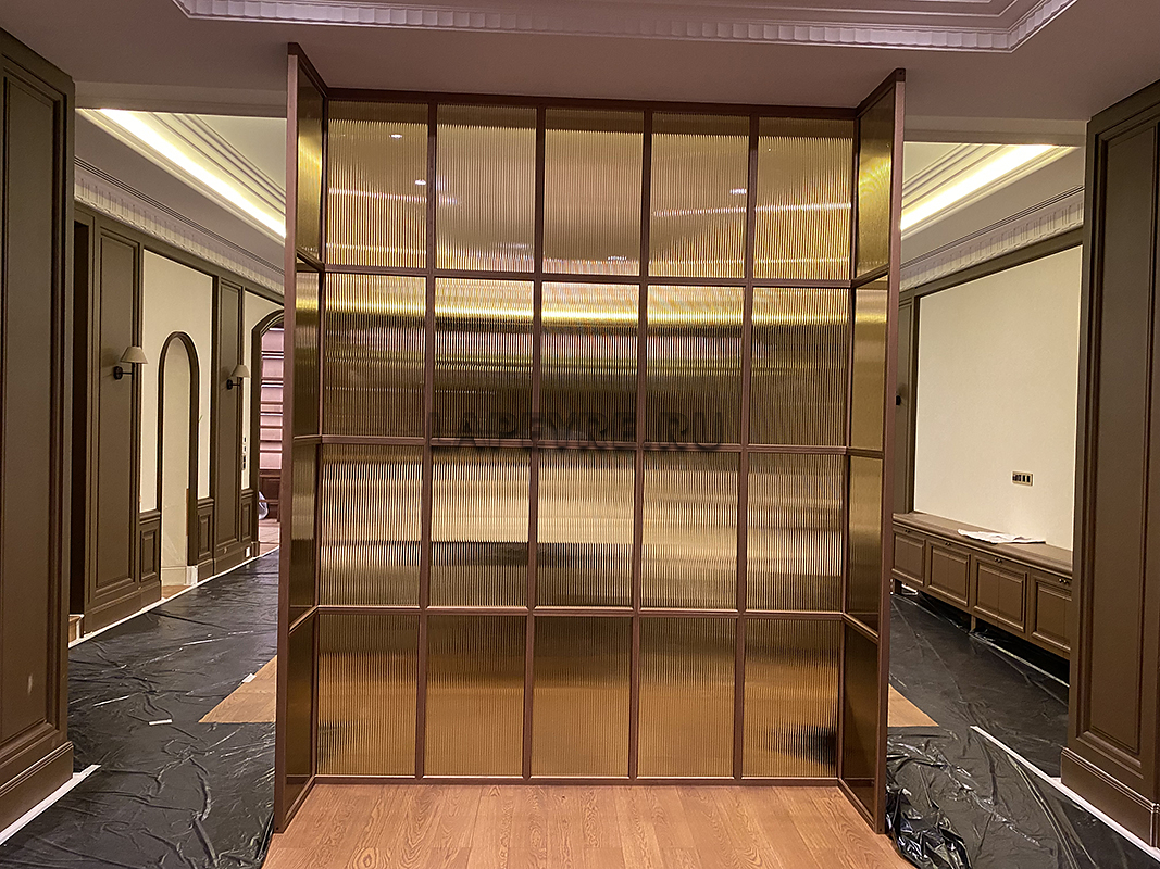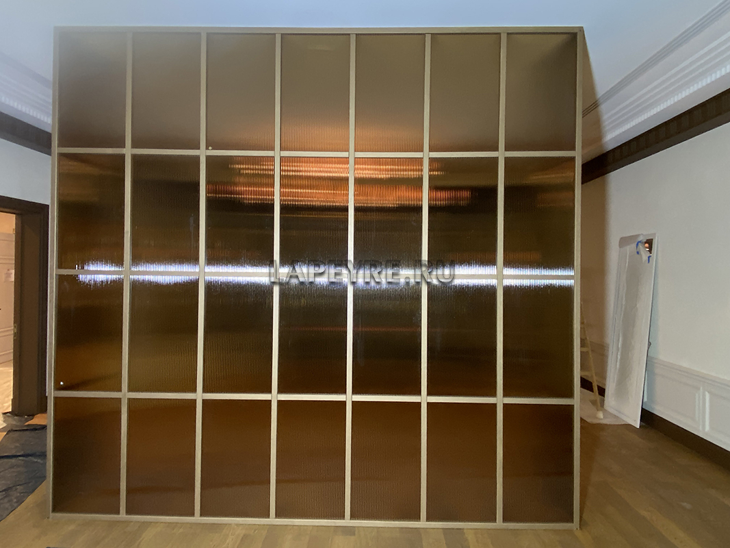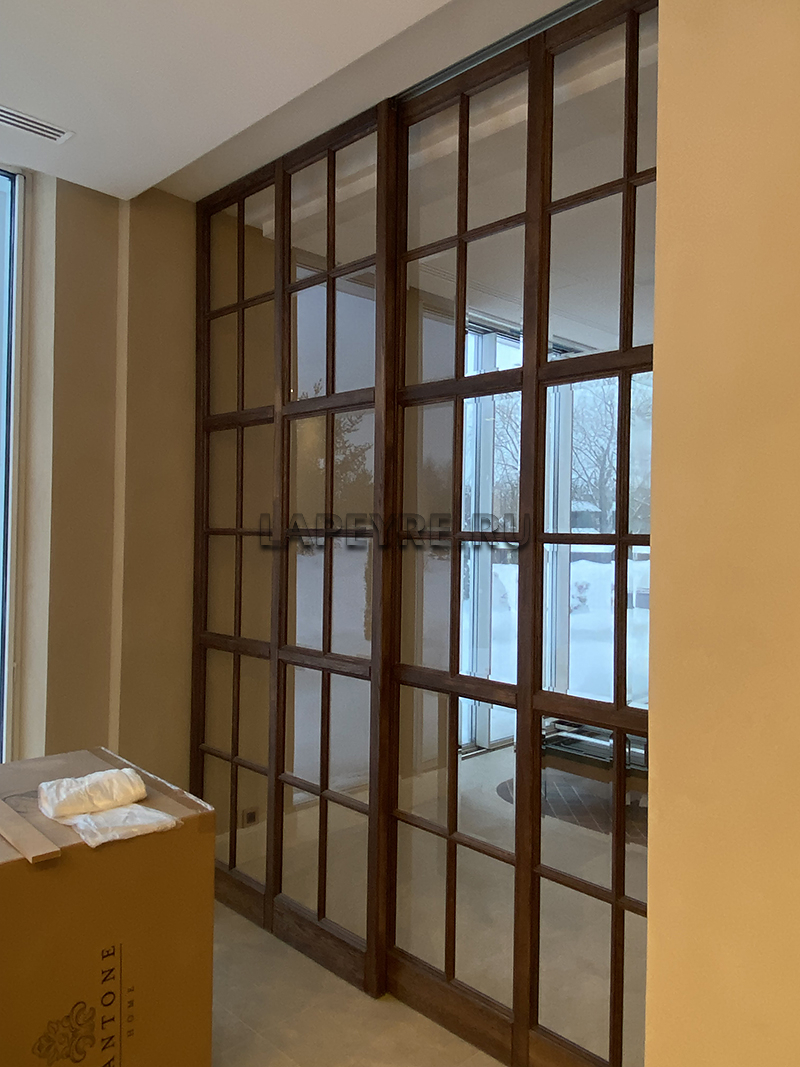 Большие и стильные перегородки из массива дуба (В.3520хШ.3750хГ. 750 мм) и закаленного стекла Моруа (Италия), огромные раздвижные витражные двери (полотно В. 3420хШ.1470хГ.56 мм - 2 шт) и легкие шаттерсы модель ECOWOOD в эмали.
