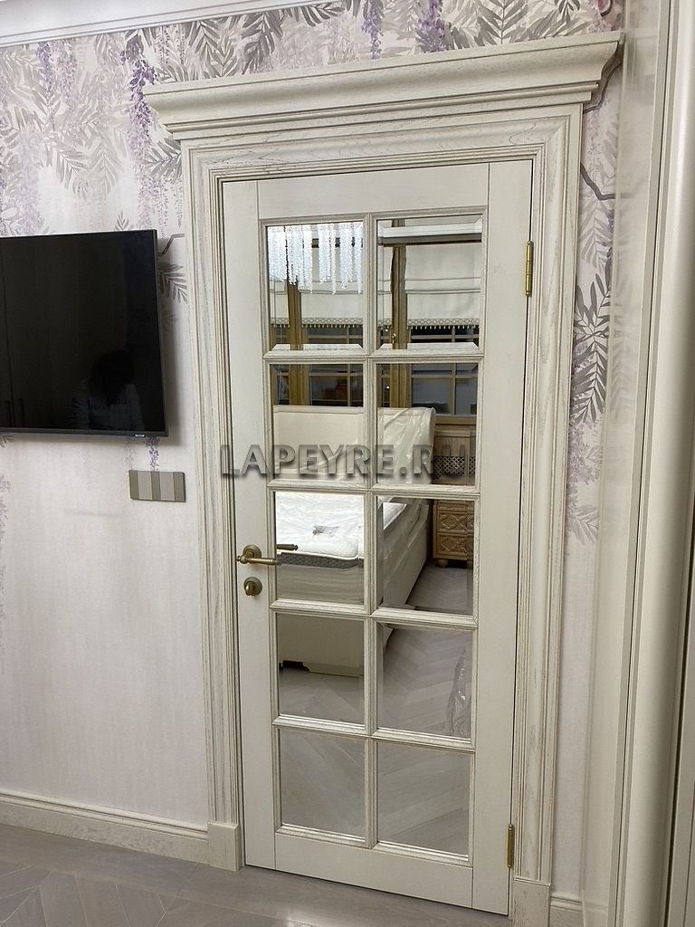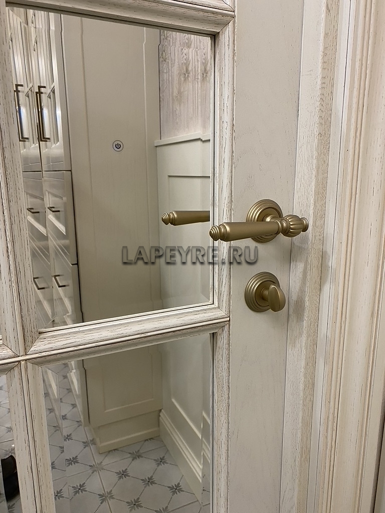 Классические межкомнатные двери «Classique a vitrer», материал — аюс комбинируемый, финишная отделка — Т2, основной цвет + патина. Ручки для межкомнатных дверей «Savoie» — полированная латунь и «Style» — сатинированная сталь.
