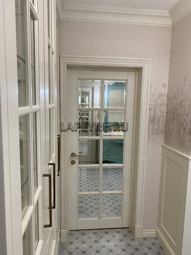 Классические межкомнатные двери «Campagne», «Quercy» и «Habitat», отделка — окрашивание, искусственное состаривание, покрытие маслом. Цветные стекла из частной коллекции, предоставлены заказчиком. Ручки для межкомнатных дверей массивного литья: «Elba» цвета состаренного серебра и «Auvergne» цвета состаренной латуни.